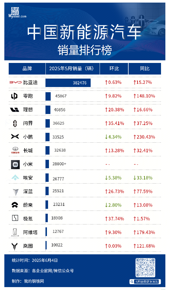 據(jù)Mysteel不完全統(tǒng)計,截至2025年6月4日,13家主流車企發(fā)布2025年5月新能源汽車銷量數(shù)據(jù),11家車企實現(xiàn)同比正增長。