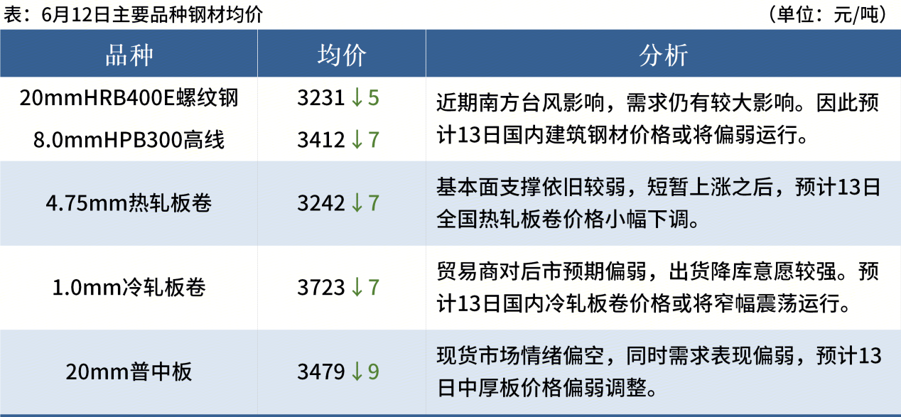 ◎ 6月12日,國內(nèi)鋼材市場震蕩偏弱運(yùn)行,唐山遷安普方坯出廠含稅下跌30報2890元/噸。