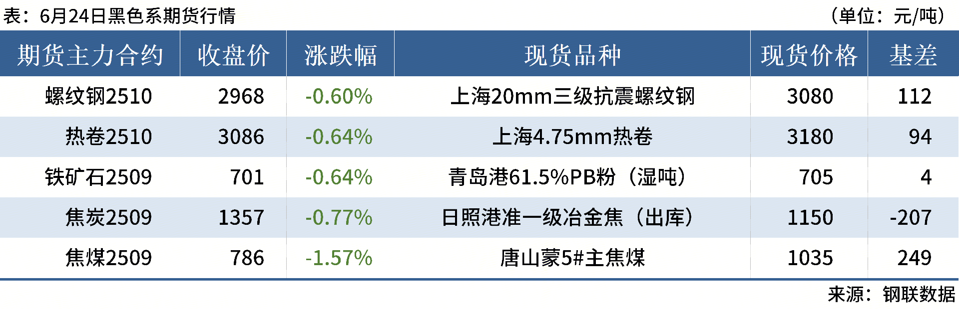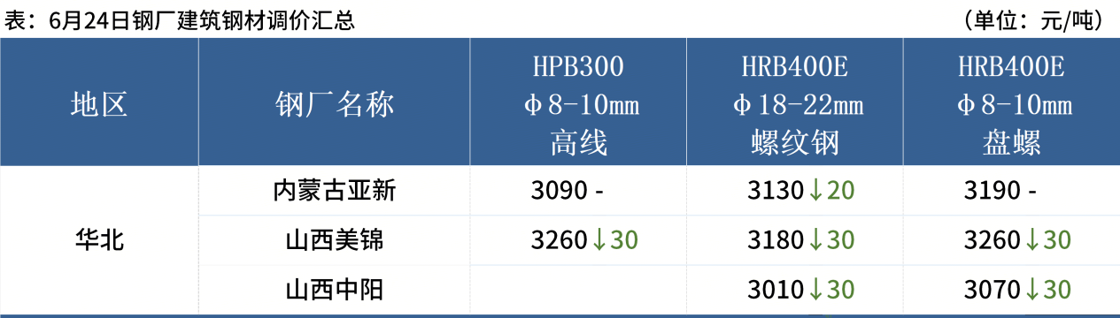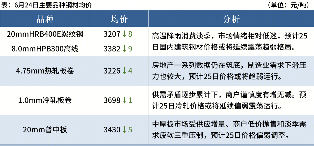 ◎ 6月24日,全國(guó)主港鐵礦石成交81.30萬(wàn)噸,環(huán)比減31.2%;237家主流貿(mào)易商建筑鋼材成交9.32萬(wàn)噸,環(huán)比減9.5%。