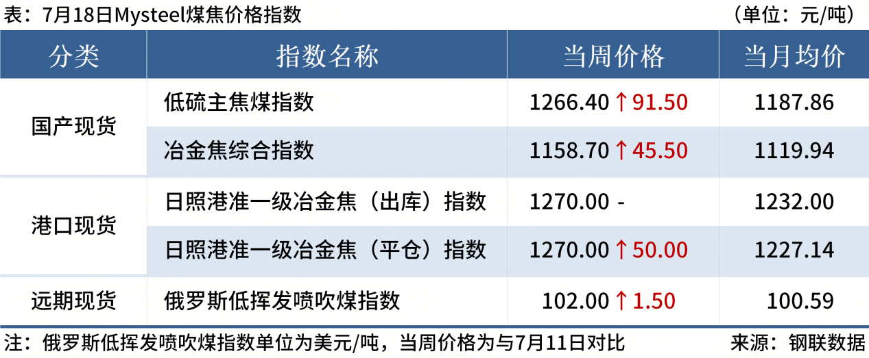 ◎ 7月煉焦煤價(jià)格整體呈現(xiàn)穩(wěn)中趨強(qiáng)態(tài)勢。安澤低硫主焦煤出廠價(jià)從1170元/噸升至1300元/噸,漲幅11.1%,成為領(lǐng)漲品種。詳情>>