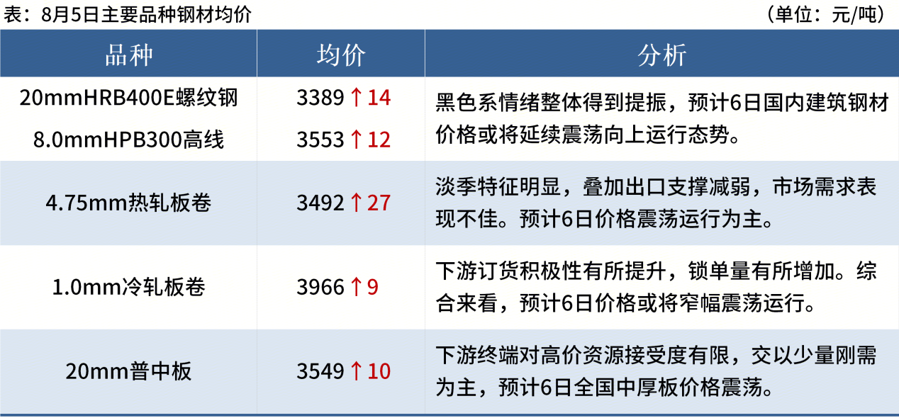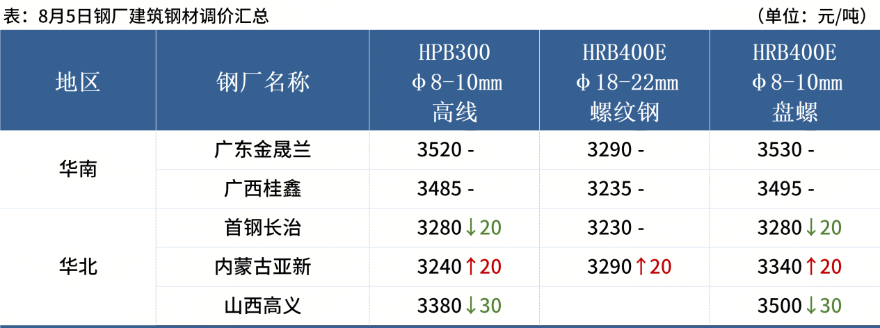 ◎ 8月5日,唐山遷安普方坯出廠含稅價(jià)上漲30報(bào)3080元/噸。