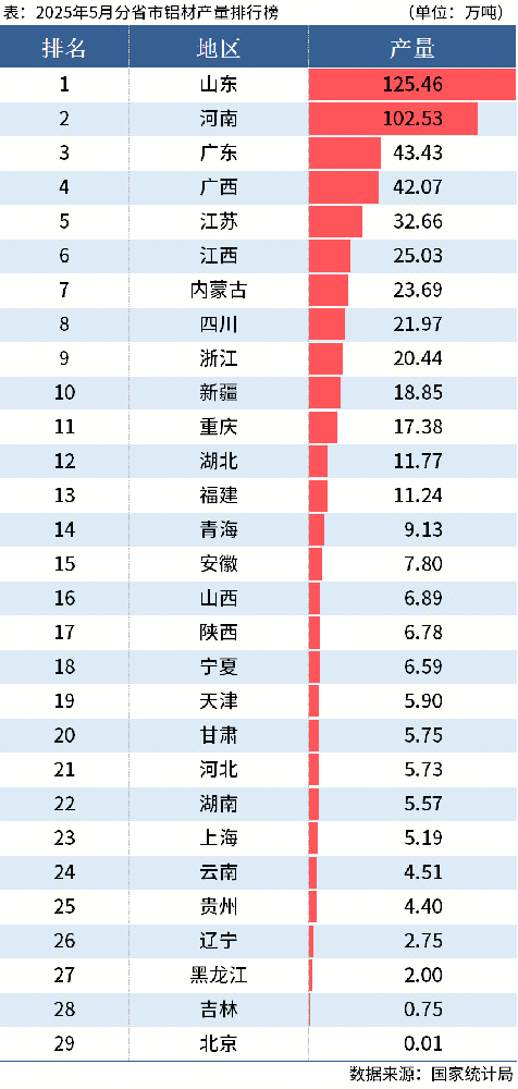 國家統(tǒng)計(jì)局?jǐn)?shù)據(jù)顯示,2025年5月中國鋁材產(chǎn)量576.2萬噸,同比增長0.4%;1-5月累計(jì)產(chǎn)量2683.1萬噸,同比增長0.6%。