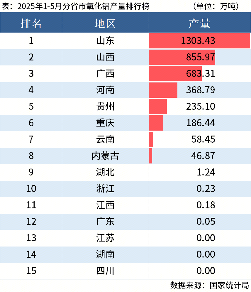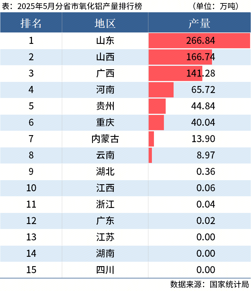 國家統(tǒng)計(jì)局?jǐn)?shù)據(jù)顯示,2025年5月中國氧化鋁產(chǎn)量748.8萬噸,同比增長5.0%;1-5月累計(jì)產(chǎn)量3740.1萬噸,同比增長9.5%。
