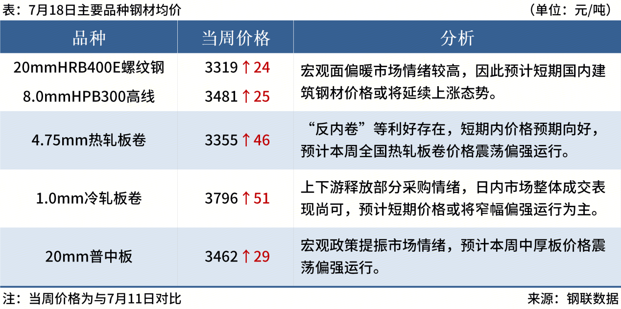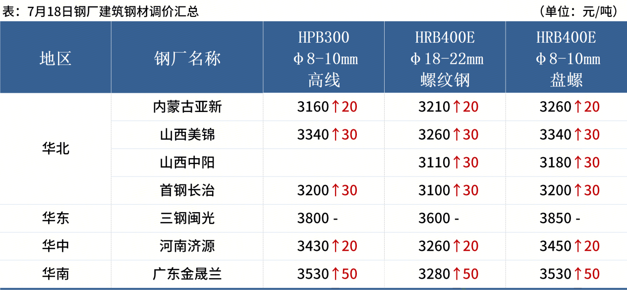 ◎ 7月20日,中天鋼鐵出臺7月下旬價(jià)格:螺紋、線材、盤螺上調(diào)100元/噸。現(xiàn)華東螺紋3430元/噸,線材盤螺3680元/噸。