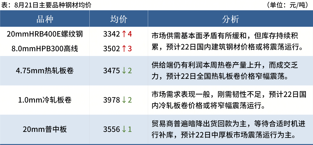 ◎ 8月21日,全國(guó)主港鐵礦石成交91.70萬(wàn)噸,環(huán)比減22.9%;237家主流貿(mào)易商建筑鋼材成交9.35萬(wàn)噸,環(huán)比減8.5%。