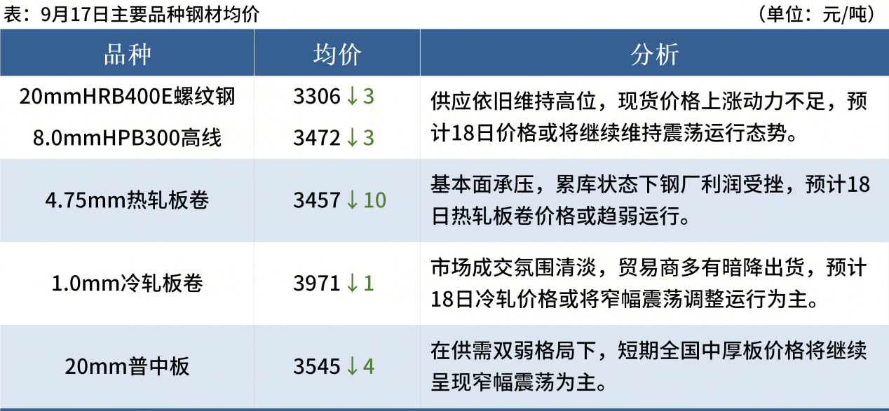 ◎ 9月17日,全國主港鐵礦石成交126.50萬噸,環(huán)比減9.3%;237家主流貿(mào)易商建筑鋼材成交10.27萬噸,環(huán)比減7.1%。
