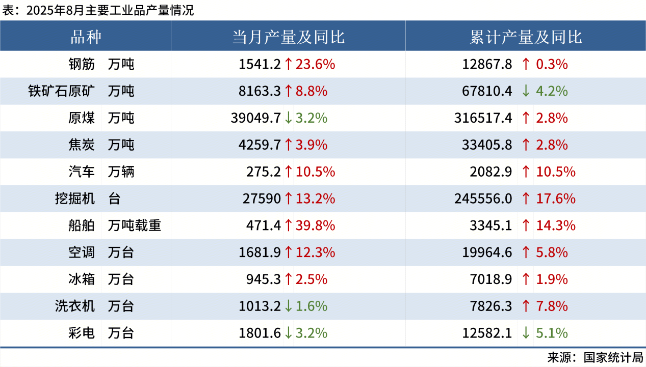 ◎ 國家統(tǒng)計局:8月中國鋼筋產(chǎn)量為1541.2萬噸,同比增長23.6%;1-8月累計產(chǎn)量為12867.8萬噸,同比增長0.3%。其他主要工業(yè)品產(chǎn)量如下: