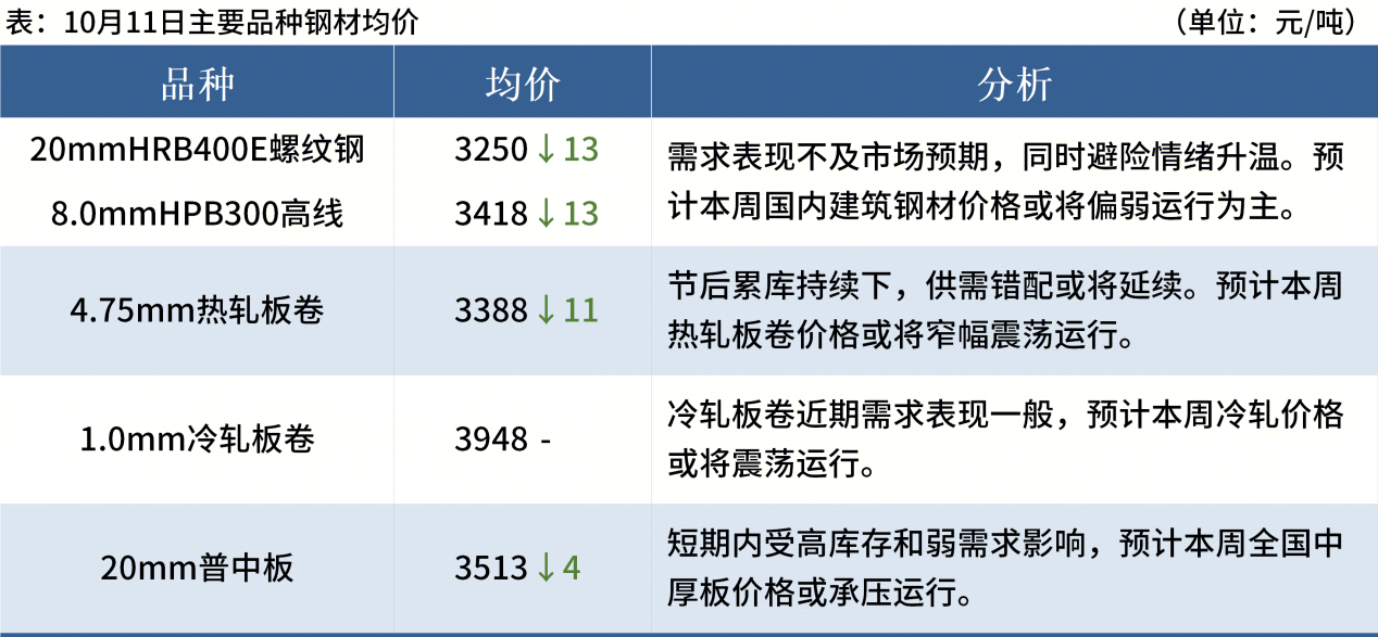 ◎ 10月11日,全國主港鐵礦石成交50.60萬噸,環(huán)比減58.3%;237家主流貿(mào)易商建筑鋼材成交9.14萬噸,環(huán)比減7.1%。