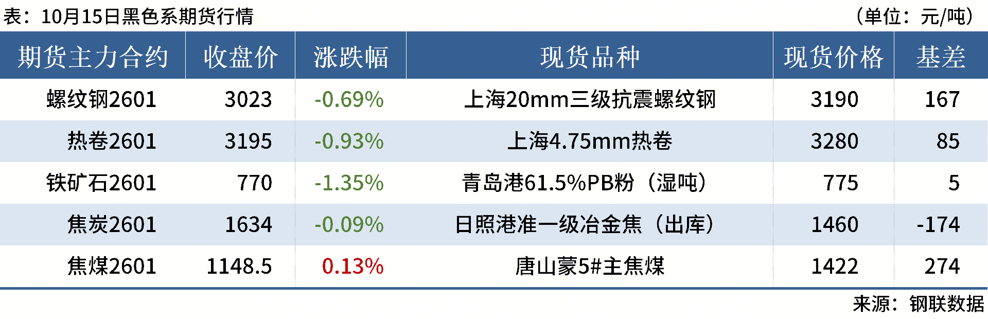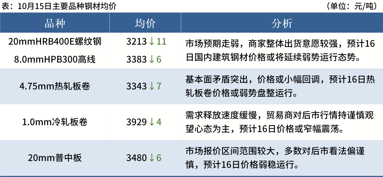 ◎ 10月15日,全國(guó)主港鐵礦石成交124.40萬(wàn)噸,環(huán)比減33.1%;237家主流貿(mào)易商建筑鋼材成交9.14萬(wàn)噸,環(huán)比減3.4%。